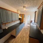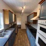 Kitchen, with range of units, cooker and door to rear garden