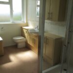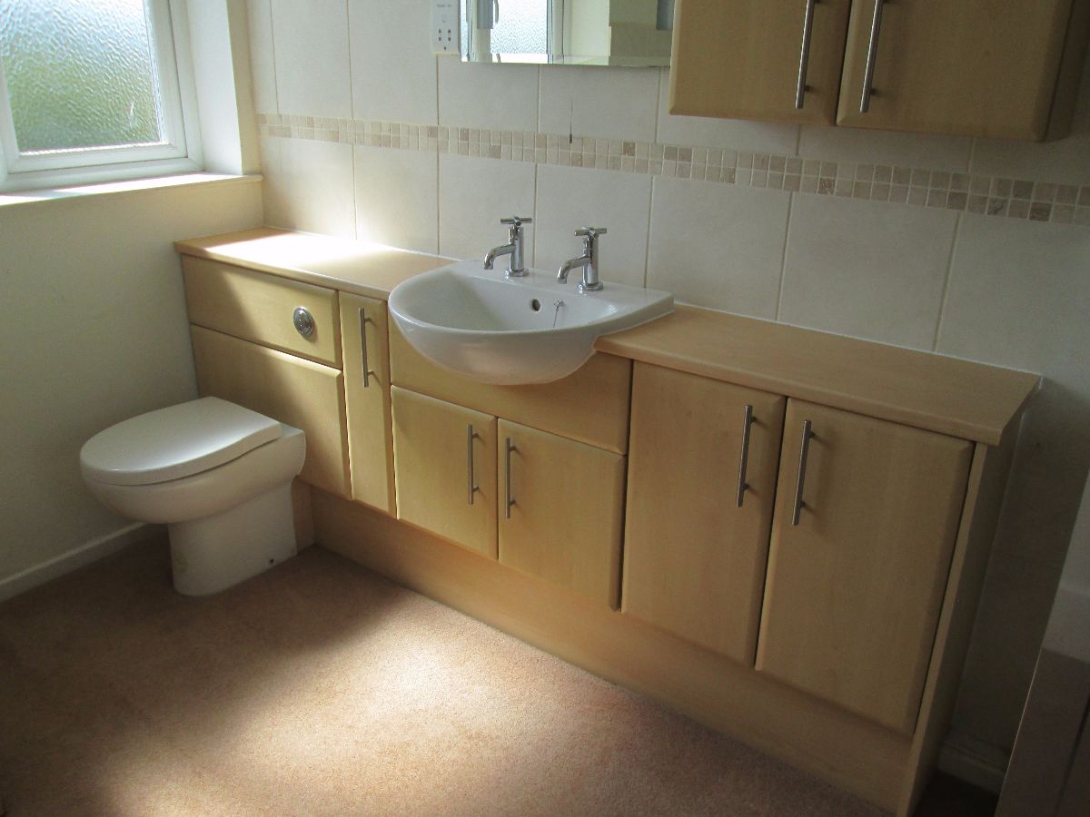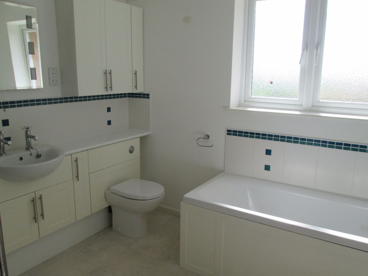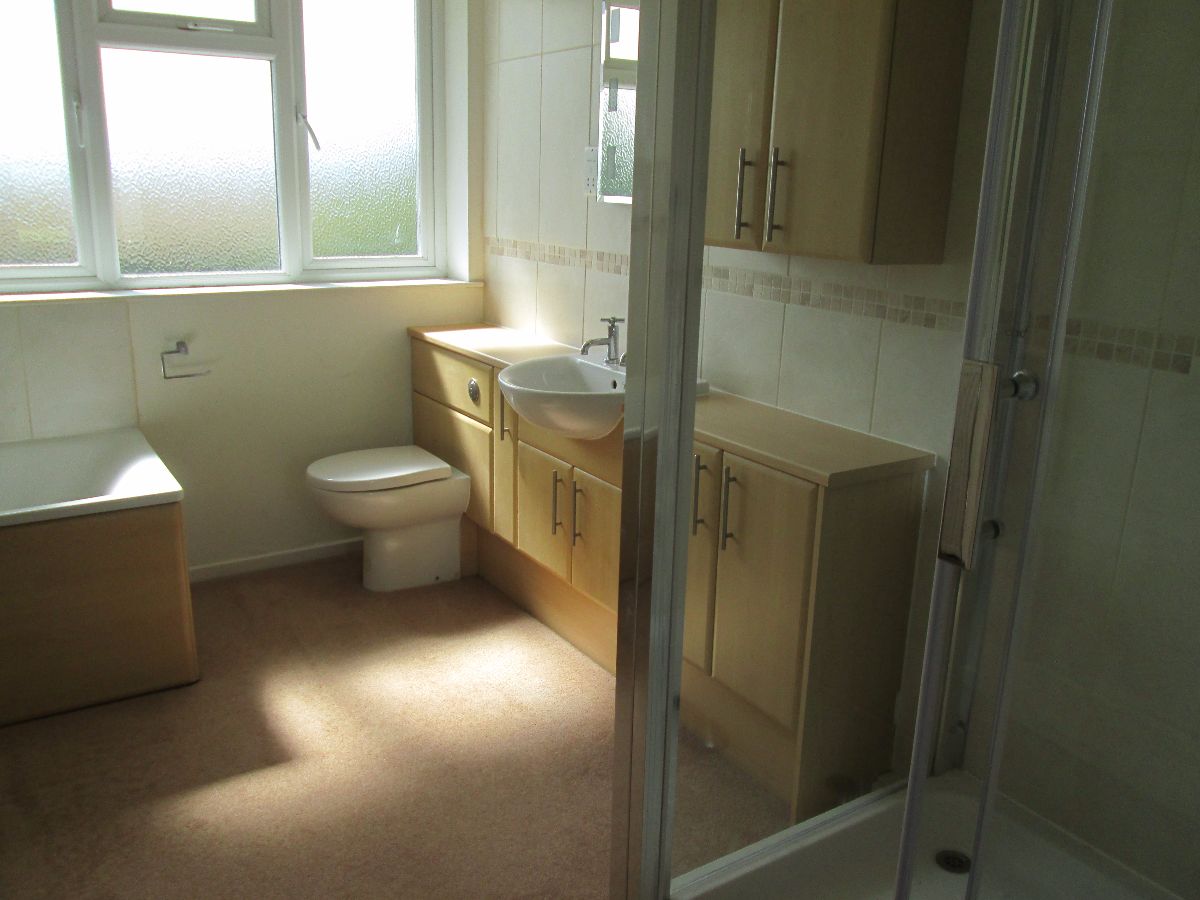 Fitted with a white suite comprising Bath with chrome shower attachment over, Shower Cubicle with mains fed shower, WC and Hand basin fitted to vanity unit, chrome heated towel rail.